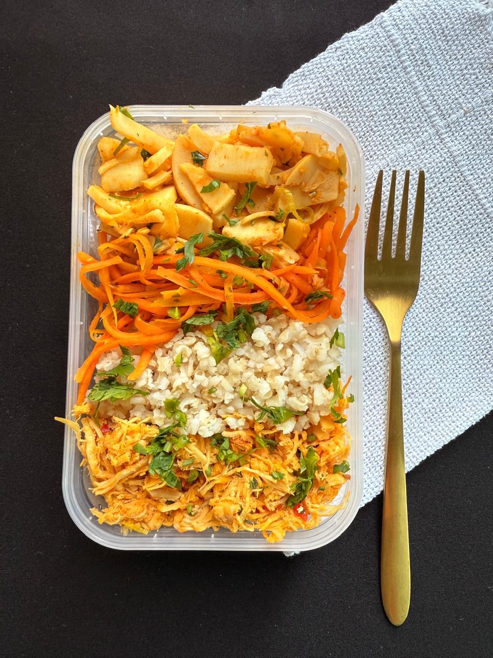 FRANGO DESFIADO ARROZ BRANCO,CENOURA,PALMITO