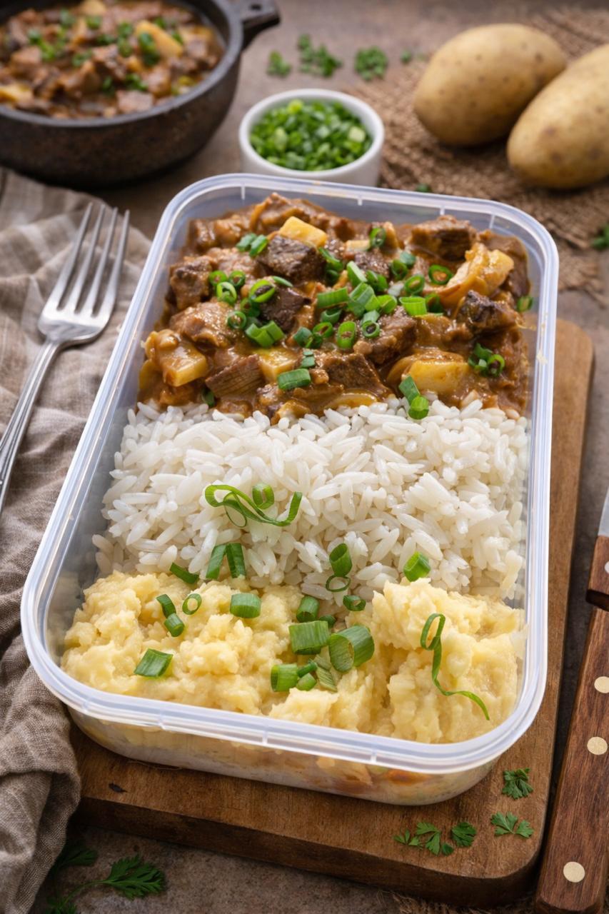 STROGONOFF DE CARNE,ARROZ BRANCO,PURÊ